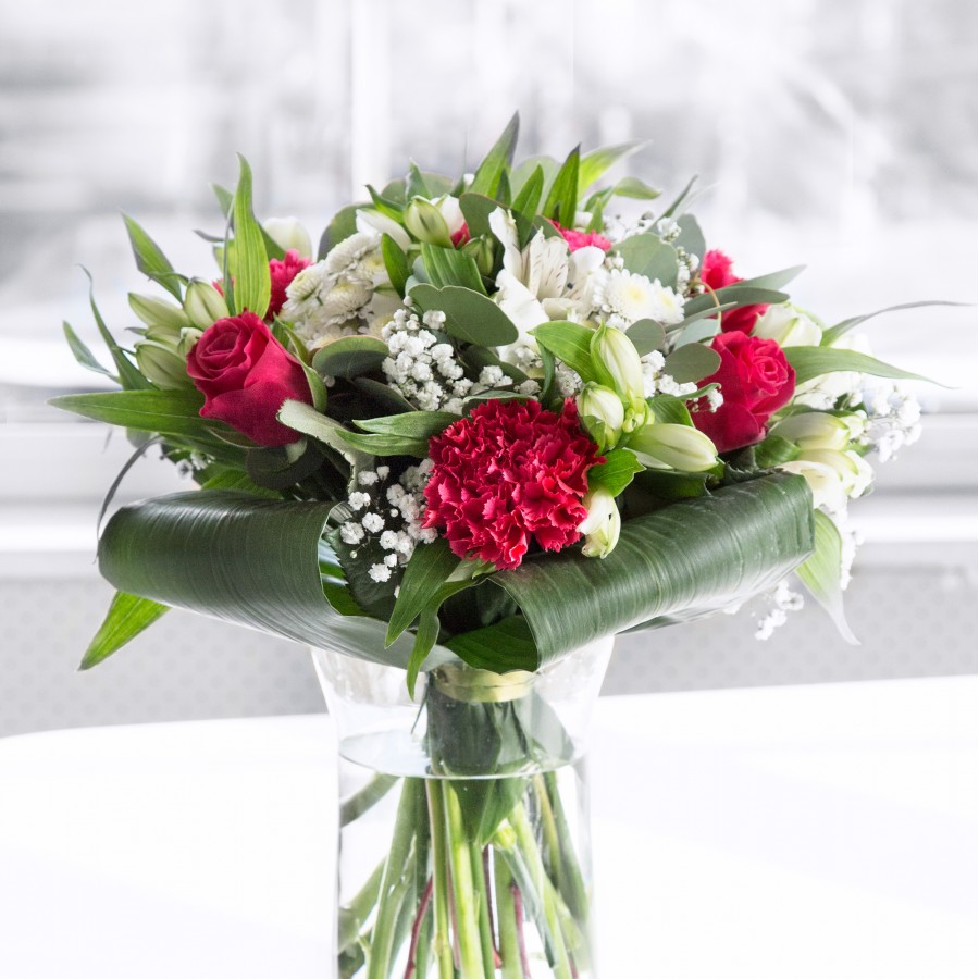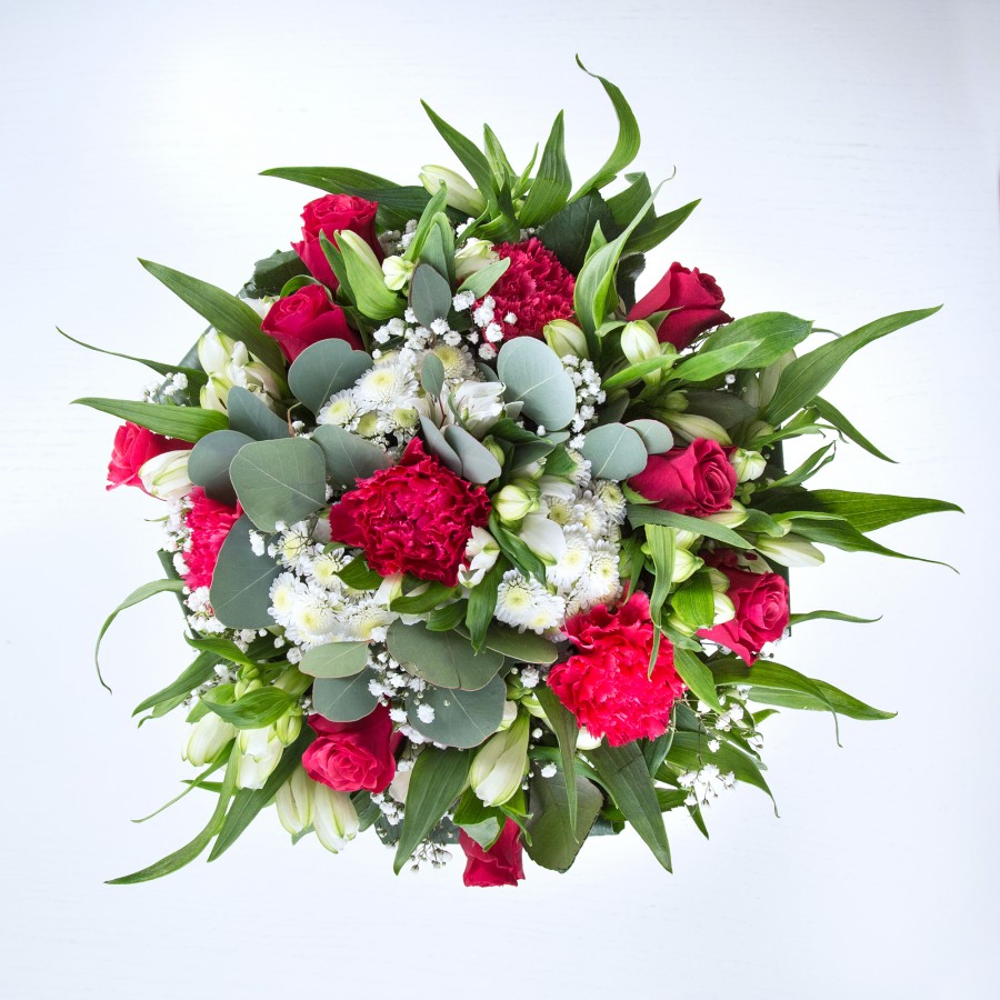 Immerse yourself in the symphony of colors with our Luxury Blossom Symphony arrangement. Showcasing gleaming white chrysanthemums alongside airy gypsophila, the bouquet features the drama of red roses and the softness of carnations. The elegant touch of white alstroemeria and the verdant detail of aspidistra leaves creates a breathtaking floral narrative.
